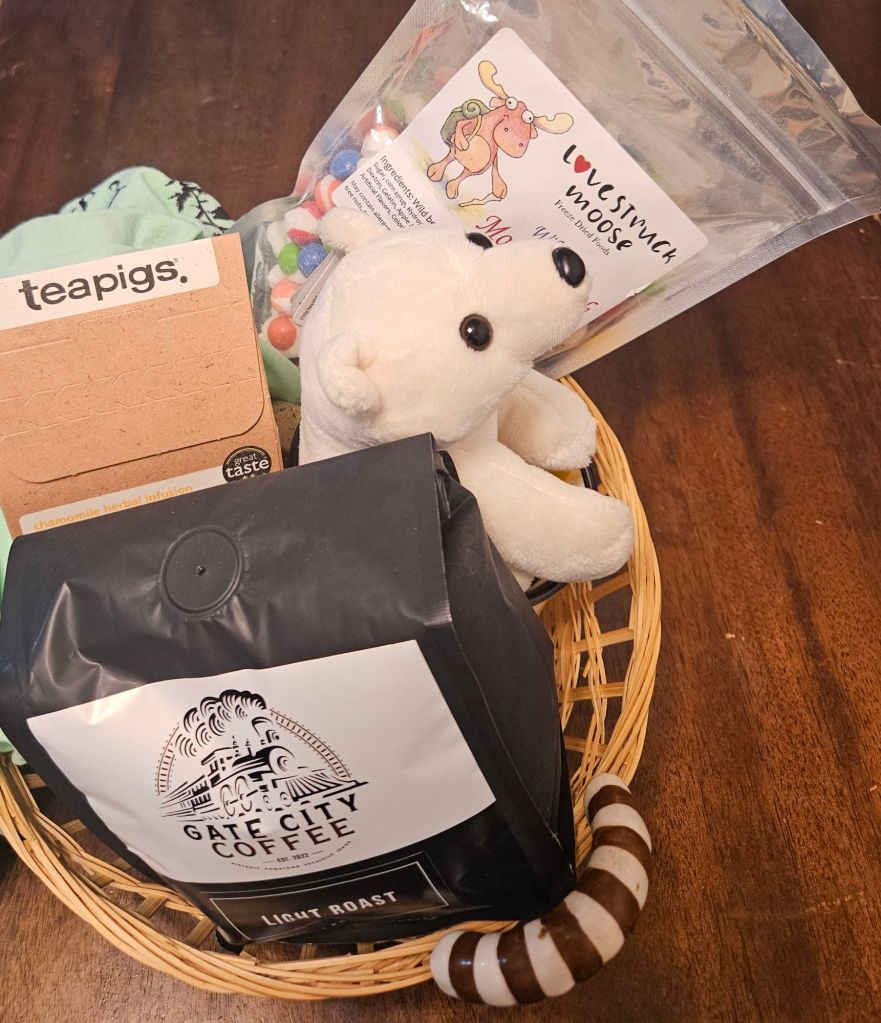 This gift basket from Gate City Coffee includes a 12 Oz, 34 Og bag of โlight roastโ fresh roasted coffee; Teapigs chamomile flowers. naturally caffeine-free, 15 tea temples; 6 Oz Livestr7ck Moose Freeze Dried Foods Wild Berry Moose Munch; a $20 gift card; a stuffed animal; a mug; and a t-shirt. A $120 value.
