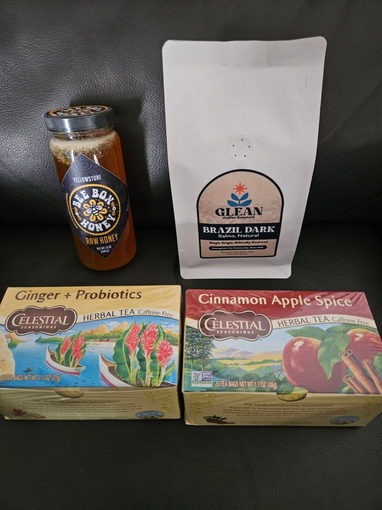 New Silent Auction item. Coffee, tea, and honey evening. Brazil Dark Salmo Natural from Glean Coffee Roasters, a jar of Bee Box Honey and two Celestial Seasonings teas – 1) Ginger + Probiotics 2) Cinnamon Apple Spice. Value $50.