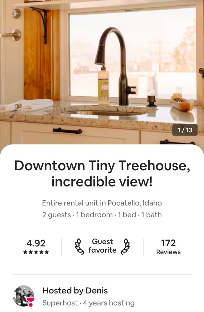 Win TWO nights at this Downtown Tiny Treehouse, incredible view! Entire rental unit in Pocatello, Idaho. 2 guests. 1 bedroom 1 bed 1 bath.